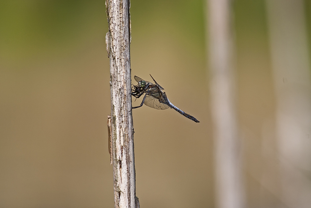 Großer Blaupfeil mit Beute, Gemeine Winterlibelle, Exuvie