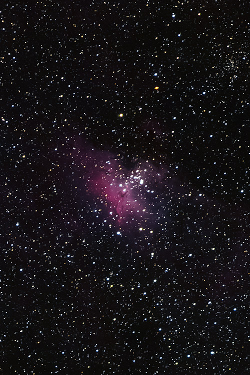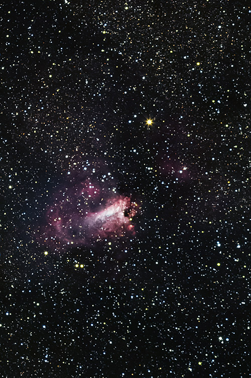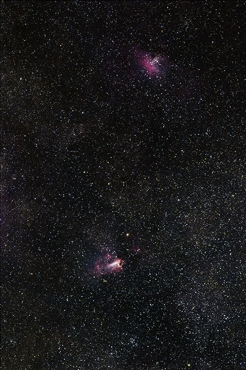 Omeganebel (M17), Adlernebel (M16) und der offene Sternhaufen M18 (Mitte unten) im Sternbild Schütze