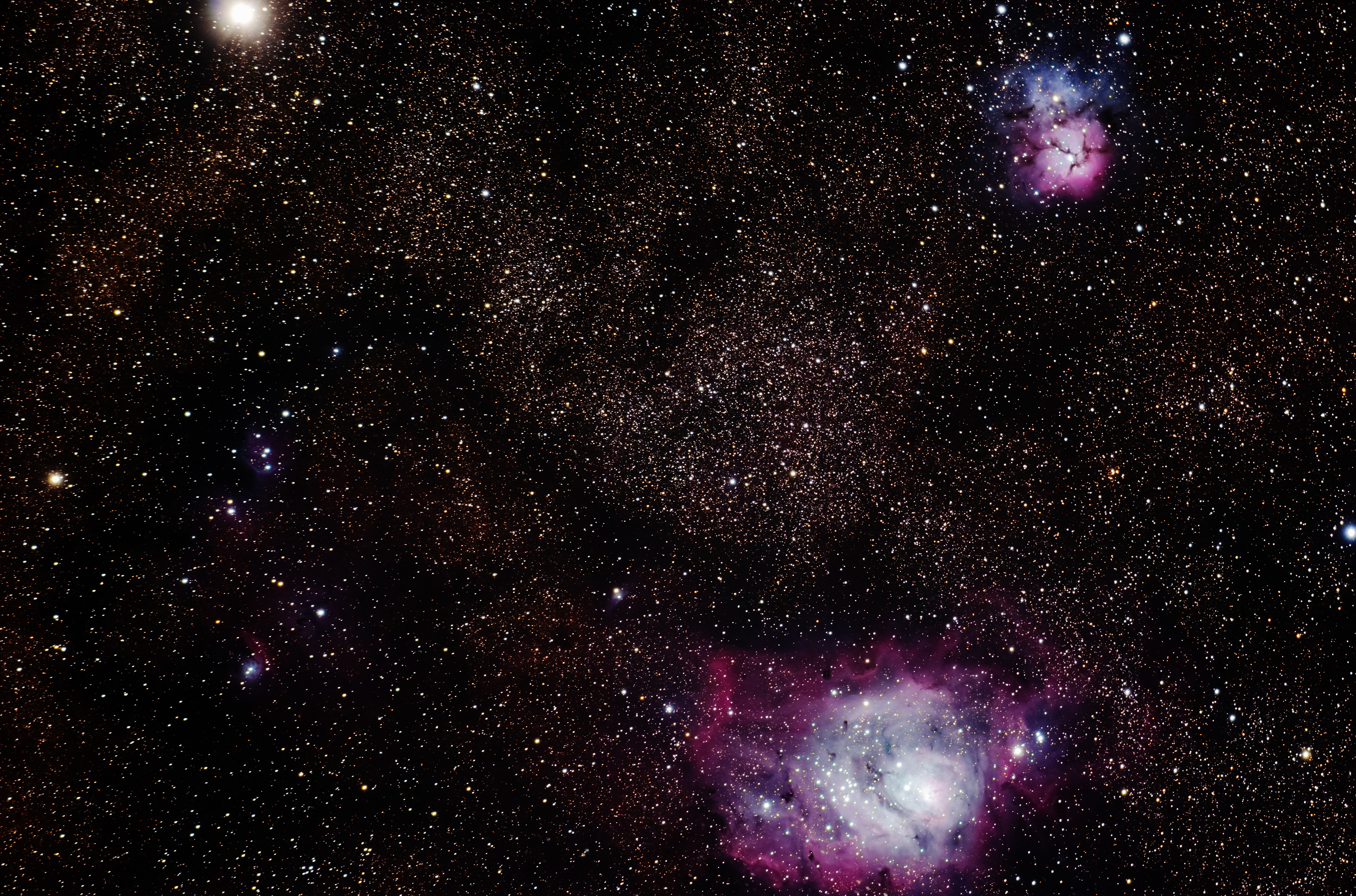 Lagunennebel M 8 und Trifidnebel M 20 und Saturn (rechts oben)