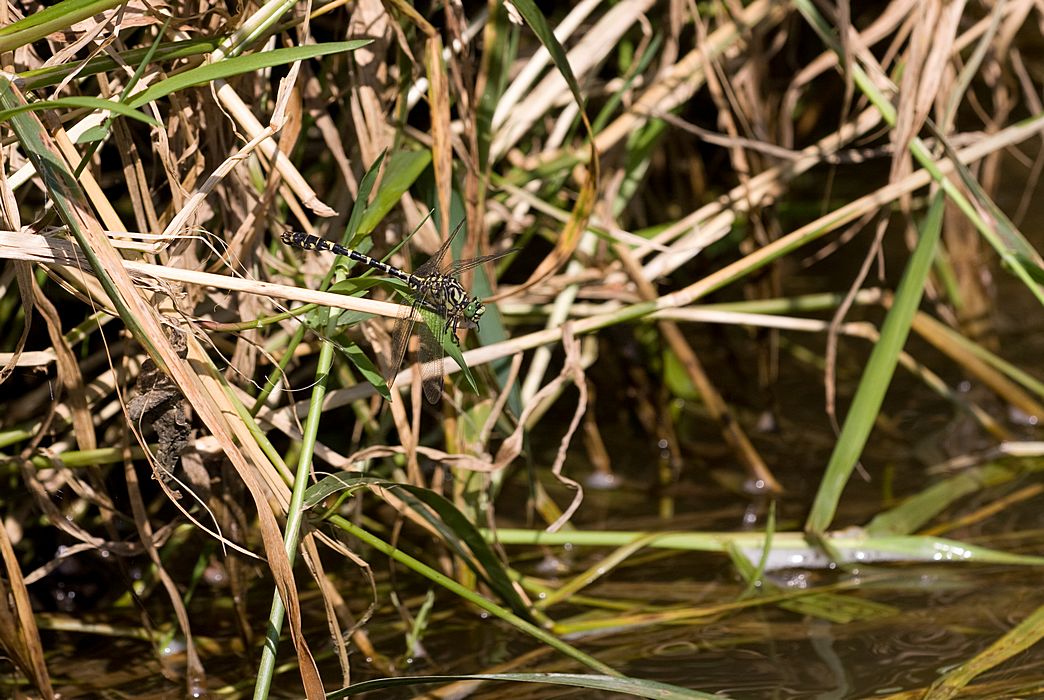 Die Kleine Zangenlibelle sitzt gut getarnt in der Ufervegetation und ist schwer zu erkennen.