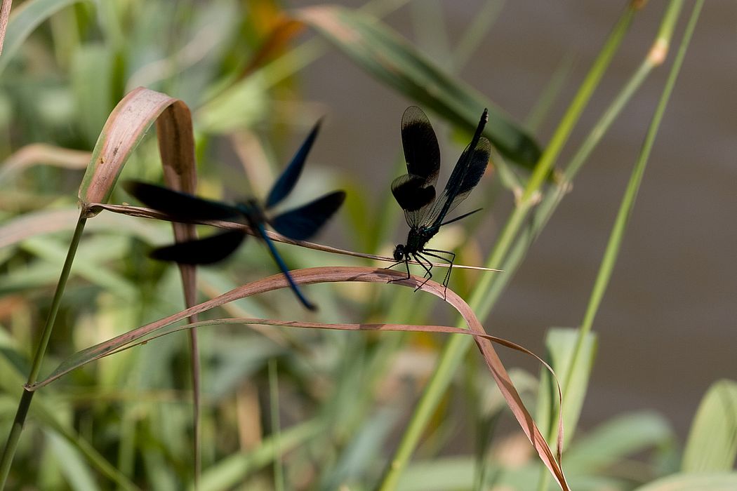 Gebänderte Prachtlibelle (C. splendens) (m), Drohgebärde gegen anfliegenden Artgenossen.