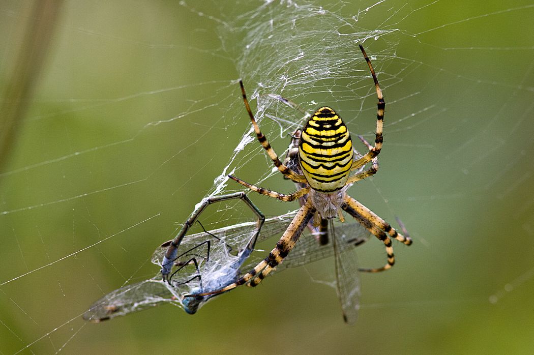 Ein Tandem der Gemeinen Binsenjungfer im Netz einer Wespenspinne.