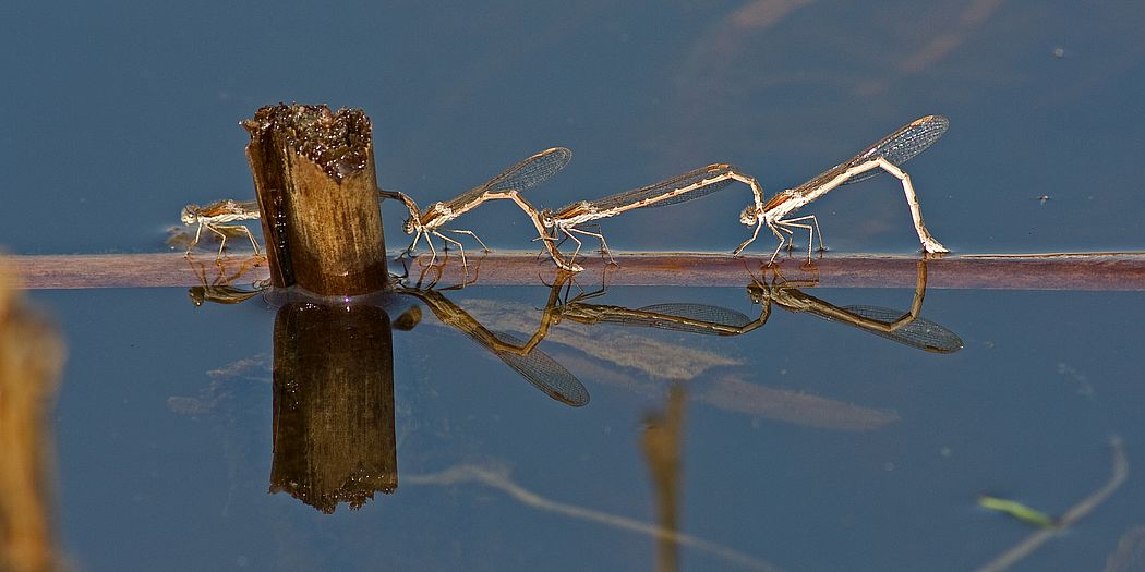 Gemeine Winterlibellen (Sympecma fusca) im "Viererpack" (bei der Eiablage), 14.04.2009