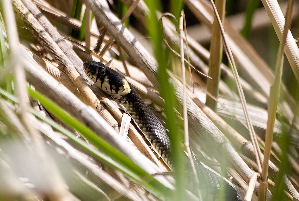 Charakteristisch ist der halbmondförmige gelbe Fleck am Hinterkopf.